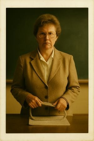 Ihr Blick konnte Tischreihen begradigen, ihr Schweigen war lauter als jedes Kind. Für sie war jeder Schüler ein Störsender, der erst durch Disziplin auf Empfang gebracht werden musste. Sie verwechselte Unruhe mit Ungehorsam, Fantasie mit Fehlverhalten. Ihr Ziel: Ruhe im Raum. Ihr Weg: die Leine der Anpassung.